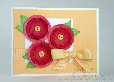 Arielle over at ColourQ has some fun bright colors this week for her ColourQ challenge #21. They are Melon Mambo, Regal Rose, Apricot Appeal, Green Galore and a neutral color (I used Whisper White.) I saw these colors and wanted to make something fun and bright, so I did! You can too, by making a card using these colors and uploading it to her blog here! I started off with a piece of textured Apricot Appeal card stock on the Whisper White card base. I made the flowers by punching out the circles in the appropriate colors using the 1 3/4", 1 3/8" and 1" circle punches. I snipped around each circle using my scissors and then used my bone folder to break down the fibers of the card stock and to curl the flowers a bit. I sponged the edges of the flowers a little to give them more dimension.