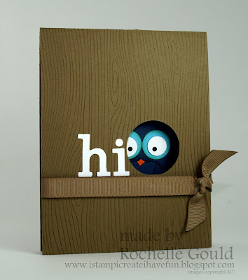 Here is what I came up with! I took a piece of Soft Suede card stock and stamped the Woodgrain background stamp onto it using Soft Suede classic ink. Next I tied a piece of 1/2" Polka-Dot Soft Suede ribbon around the card. The "hi" is die cut from the Big Shot and the Stampin' Up! Timeless Type Alphabet Junior medium sizzlits die. I used the 1 3/8" circle punch to punch out the hole for....owl to peek through! I used various Stampin' Up! punches to make the owl.